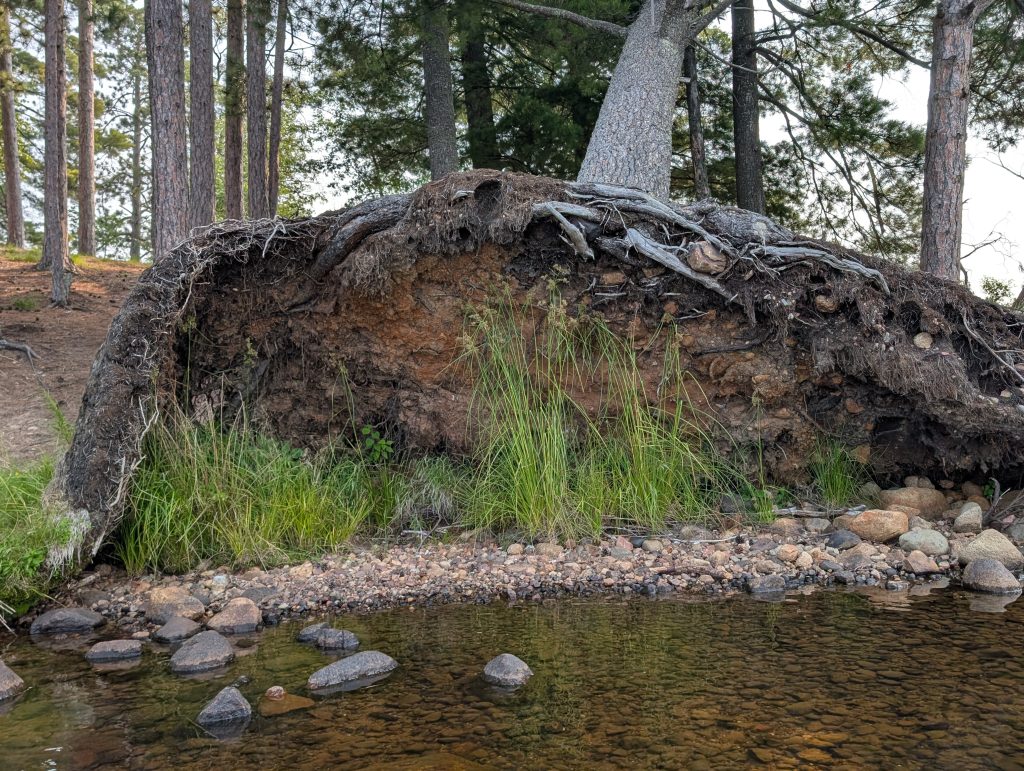 Recently, I paddled back to Half-Mile Island with hopes of learning something new from this uprooted tree. To my surprise, the area around the tree was overgrown and I was unable to see its underlying treasures. What was once exposed, is now hidden again.  What do you think the tree was thinking, inviting the brush to provide cover? Did the tree feel vulnerable during these years? Were there things the tree wishes would have remained hidden? How about you?
