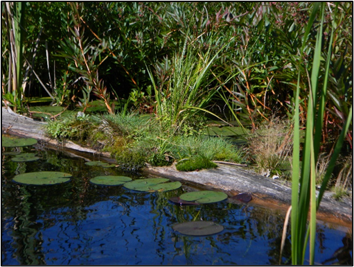 A landscaper, I think, would see the above photo as a beautifully arranged composition. The taller, green reeds provide the backdrop for lower groundcover, or “log cover” as it would be. The addition of the lily pads floating in front of this waterscape add to the expansion of its beauty. Along the backdrop of the bushy growth on the shoreline, this aquatic display makes me smile, and gives me hope. The natural rise of new plants spontaneously signals new life.