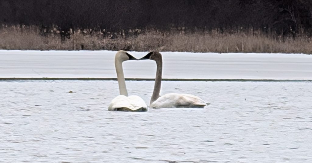 I come to the opening of a small lake, where the Trumpeter swans swim gracefully on the slice of open water. I sit and watch them for a long while, gliding majestically with ease together, while their feet paddle quickly under water. Like the seeds, all the work is done below the surface. The swans represent peace, tranquility, unity and love. A stroke of luck with my camera catches them in a tender moment.